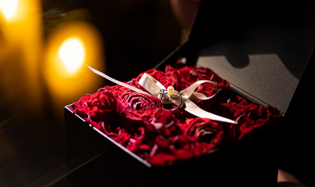 婚約指輪に添える花束を箱に敷き詰めて。箱を開けた瞬間、目の前にバラが広がります。※敷き詰めるバラの本数により金額は異なります。