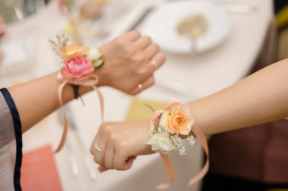 エスコートバッグにはお揃いのフラワーのリストレッドが。ゲスト全員お揃いのアイテムを身に着けて参列していただきました。