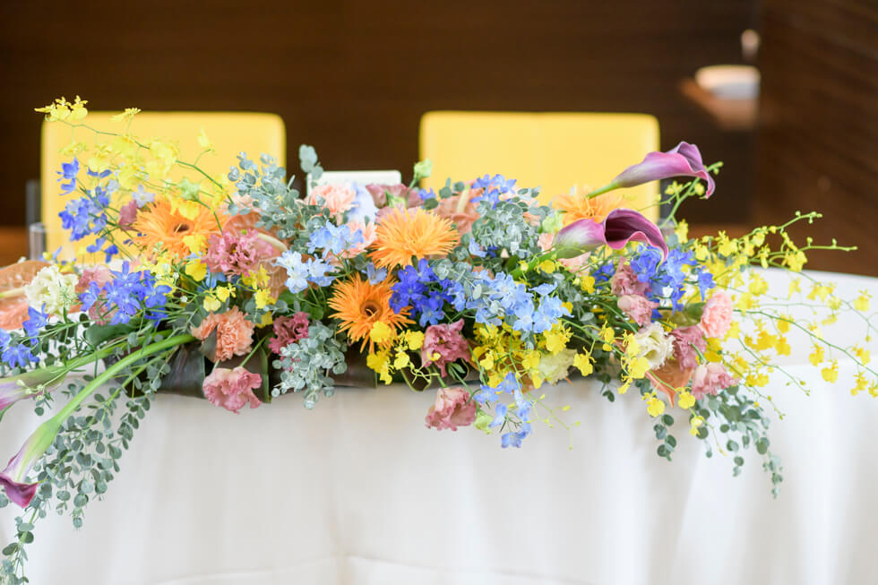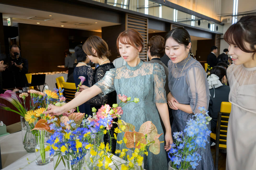 会場装花もゲストと創り上げたいとのご希望から、再入場のタイミングにフラワービュッフェを行いゲストテーブルもお色直し。