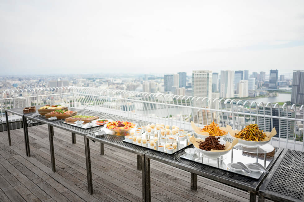 後半にはゲスト自らで彩ったカラフルなテーブルにて、おふたりが出会われた高知県にちなんだおつまみ&デザートビュッフェもお楽しみいただきました。おふたりらしさが沢山詰まった、笑顔満載のパーティーとなりました。