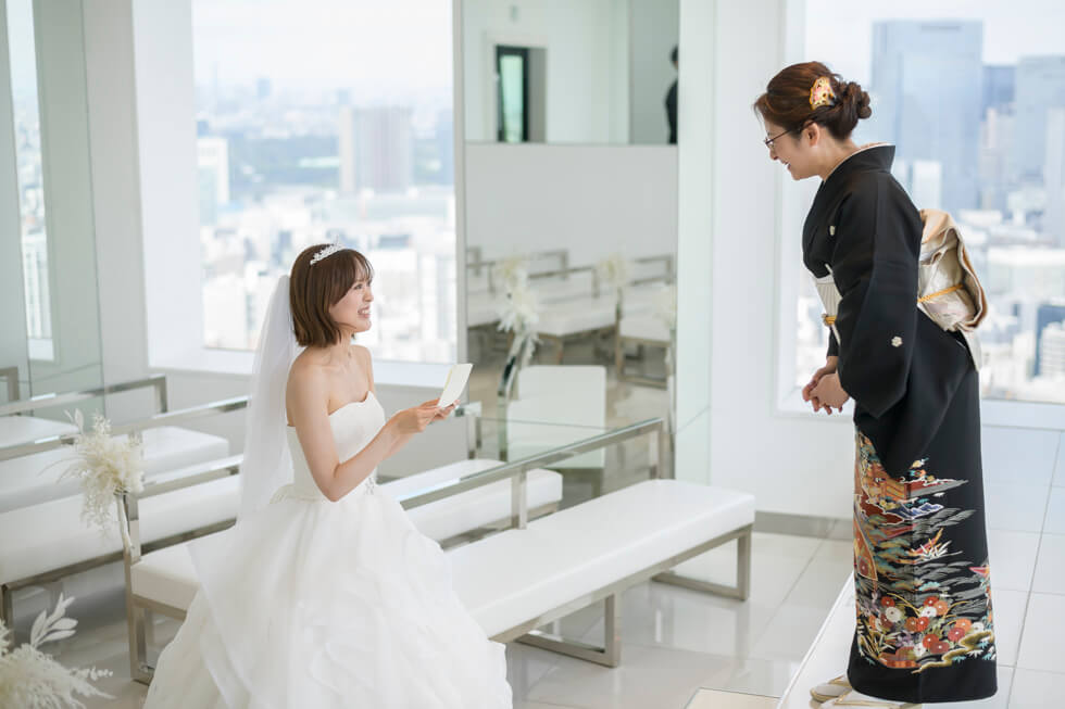 挙式リハーサルの際にお母様ヘサプライズでご新婦様のお手紙朗読を行いました。